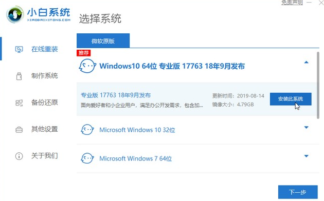 1、我们选择小白一键重装系统来重装,先选择好适合你电脑的系统版本,点击“安装此系统”下一步。