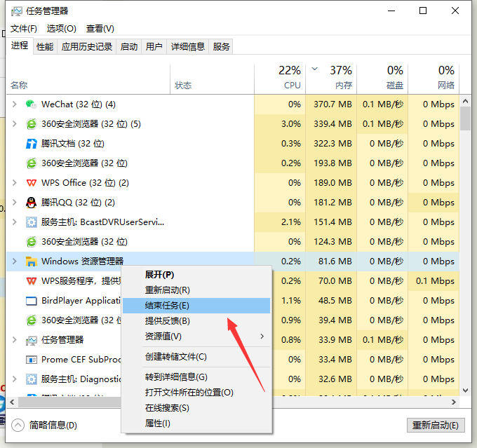 2、找到windows进程中的“windows资源管理器”,右键点击“结束任务(E)”;