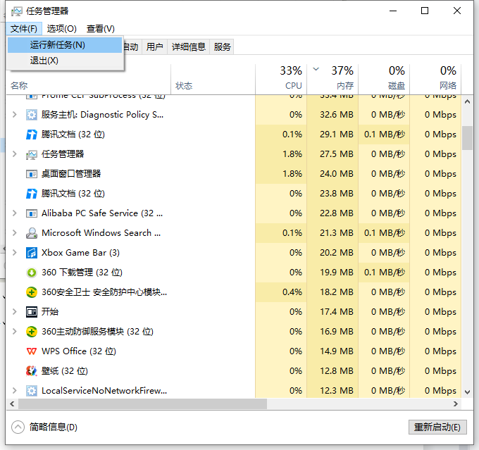 3、继续打开任务管理器,找到并点击左上角“文件”,选择“运行新任务(N)”;