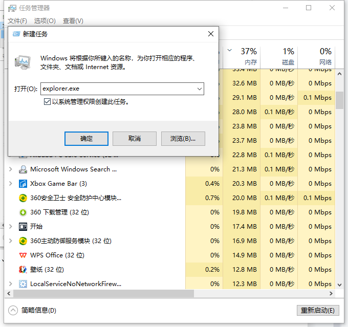 4、新建任务窗口中输入explorer.exe,确定运行即可修复。