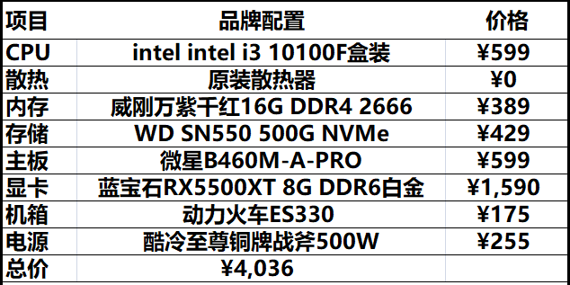 4000价位最强组装电脑配置清单2021及价格表