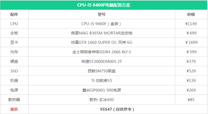 总价大约是5537元左右,当然这是京东的报价。报价日期(2020/4/14)。性能方面,综合平均跑分大约是32.1万左右,由于跑分分数受电脑状态影响会有些浮动。所以预计跑分至少在30万左右。I5 9400F也是主流装机最受欢迎的了,配合上口碑极佳的微星迫击炮,1660S级显卡 16G双通道内存,固态和机械的搭配然游戏玩家更放心空间问题。