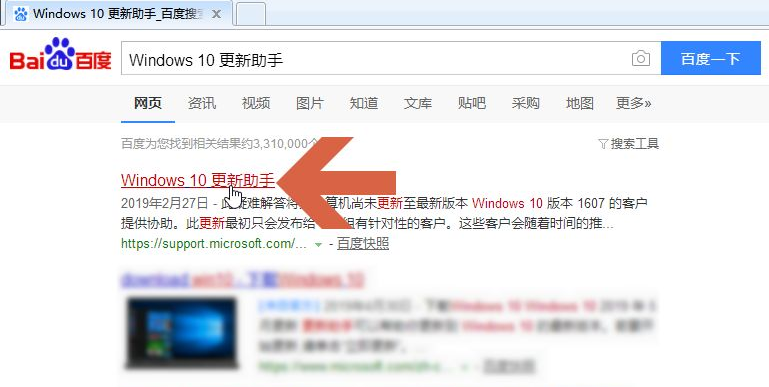 1、要使用Windows10易升软件需要先下载安装,可以先在百度搜索【Windows10更新助手】。然后在搜索结果中点击图示的【Windows10更新助手】,注意不要点击非微软的网站。