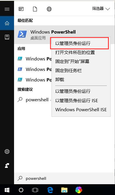1.首先我们点击win10桌面下的任务栏,找到其中的搜索框,输入“powershell”然后点击最佳匹配项,右键以管理员身份运行Windows Powershell组件。
