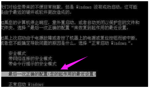 1、开机按F8不动到高级选项出现在松手,选“最近一次的正确配置”回车修复。