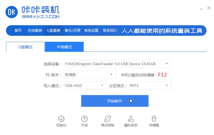 1.首先,在线下载并打开咔咔装机软件,随后插进8g以上的u盘,选择u盘重装系统模式,按下开始制作。