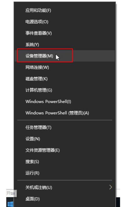 1、鼠标右键点击【开始菜单】图标,找到选【设备管理器】。
