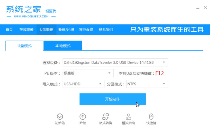 1.首先在一台可用的电脑上下载安装系统之家一键重装系统工具,插入超过8g的空u盘,选择u盘模式开始制作。