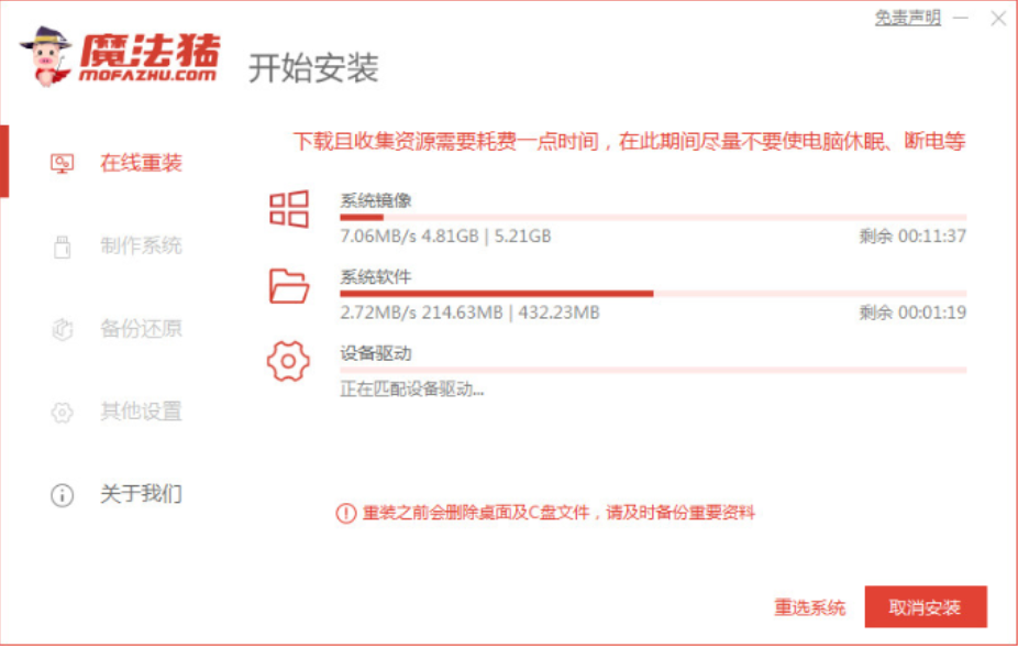 3.魔法猪自动进入到下载系统以及备份电脑相关驱动的环节,在此期间请不要使电脑休眠、断电断网等。