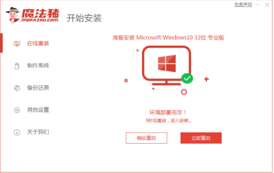 魔法猪自动下载系统等环节,等待部署完成后重启自动安装win10系统。