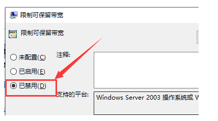步骤三:双击“保留宽带配置窗口”,然后弹出“限制可保留宽带”的界面,在此界面被禁用选择。