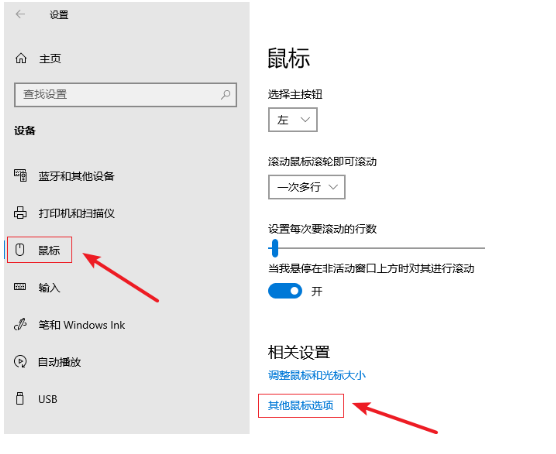 2.进入后,在左侧选择【鼠标 】,然后在右侧点击【其他鼠标选项】。
