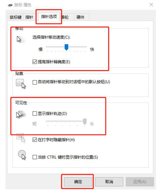 3.在鼠标属性界面,把上方的选项卡切换到【指针选项】,然后拖动移动速度的进度条调整鼠标灵敏度,调整好之后点击下方的【确定】按钮即可。