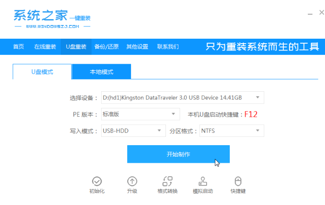 1、电脑搜索下载安装系统之家一键重装系统工具,关闭电脑的杀毒软件,插入一个8g以上的空白u盘,选择u盘模式开始制作。