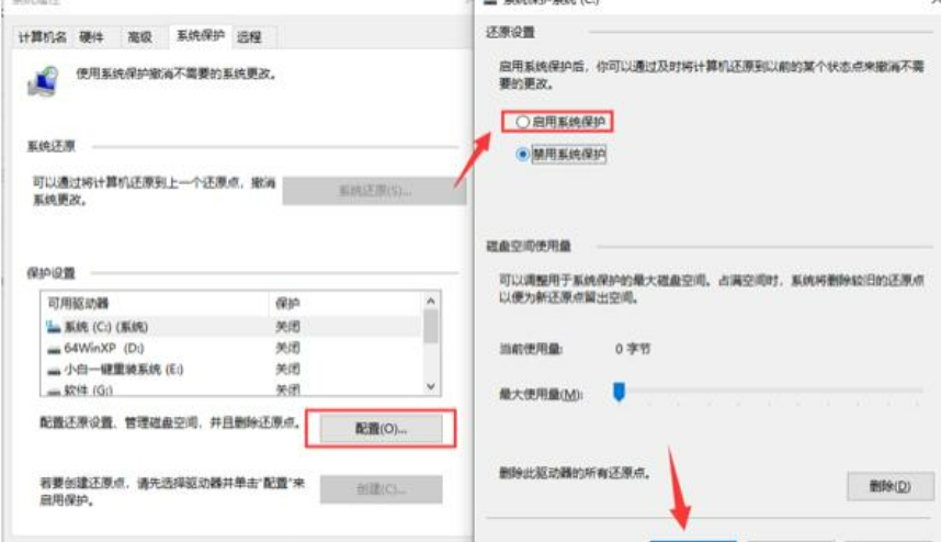 2、出现的系统属性界面中,点击“配置”,然后点击“启用系统保护”,然后点击”确定“,下图: