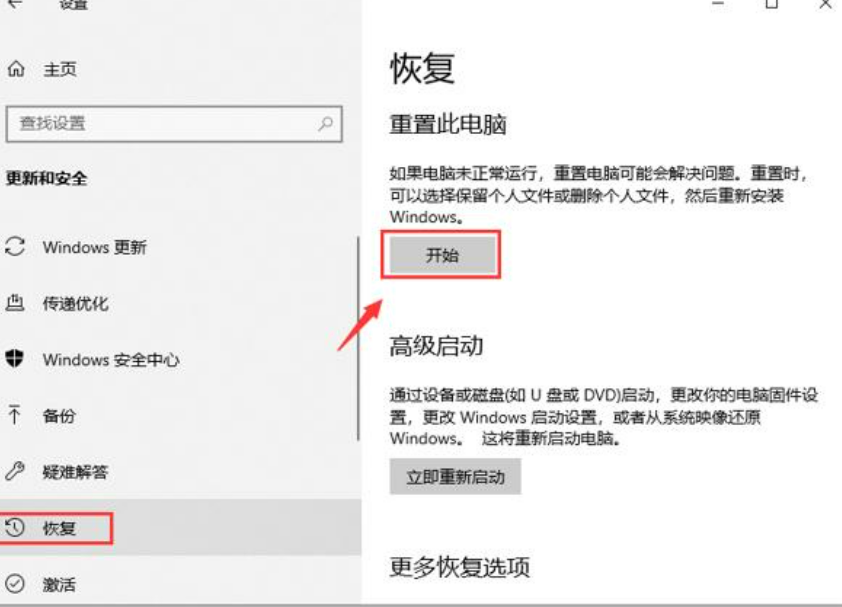 2、左侧栏找到“恢复”然后点击,再找到“重置此电脑”选项,点击“开始”按钮。
