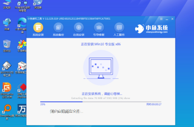 4、插入启动盘进电脑后,在开机不断按启动热键进启动界面,然后选择u盘启动项回车确定进入到pe选择界面,选择第一项pe系统回车进入。我们在pe系统桌面上打开小鱼装机工具,然后选择win10系统点击安装。