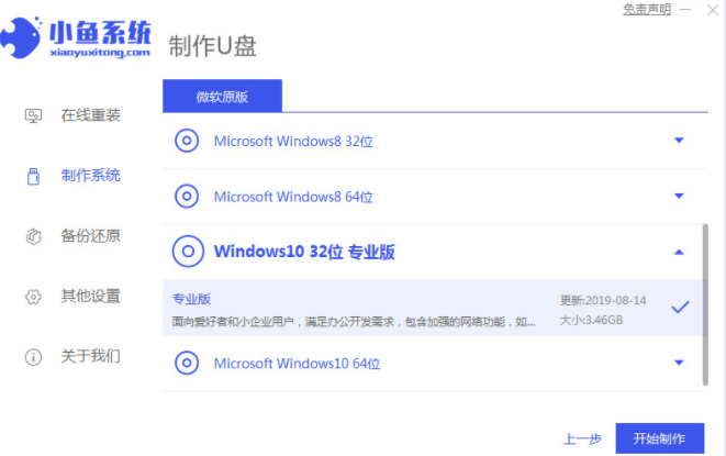 2、制作每户页面中选择需要安装的win10系统,点击开始制作。