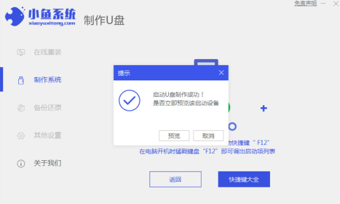 3、之后软件自动制作u盘启动盘,我们等待制作成功后,可先预览需要安装的电脑主板的启动热键,然后再拔除u盘退出软件,将u盘插到需要安装系统的电脑当中。