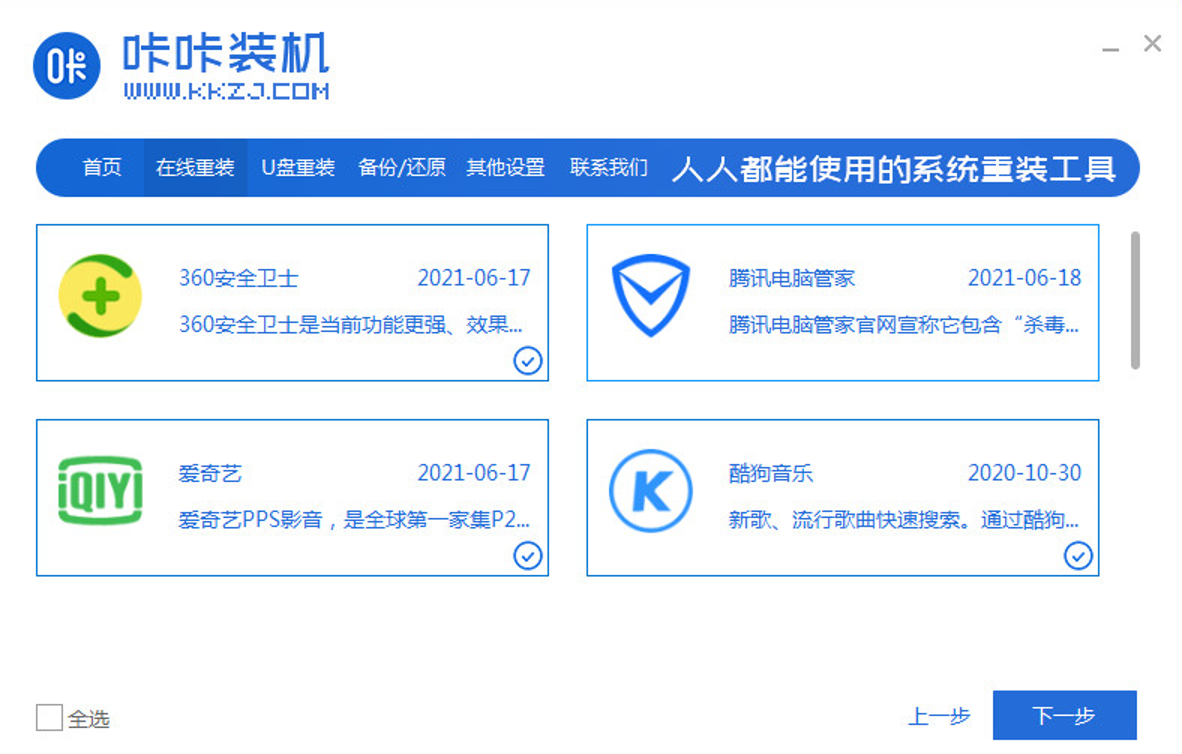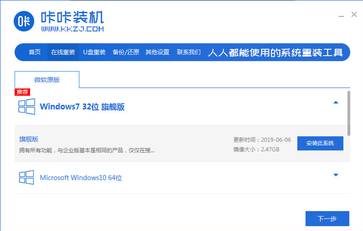 1、下载安装咔咔装机工具,选择在线重装,选择要安装的系统版本,点击下一步。