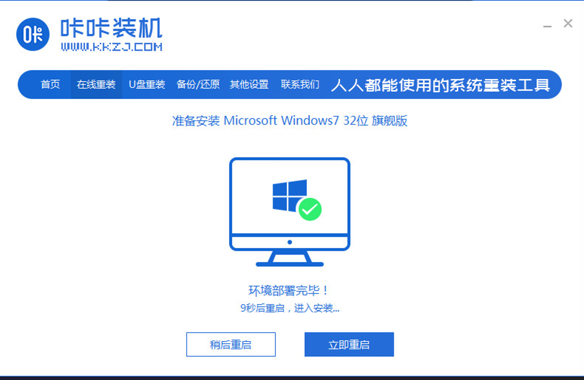 1、下载安装咔咔装机工具,选择在线重装。