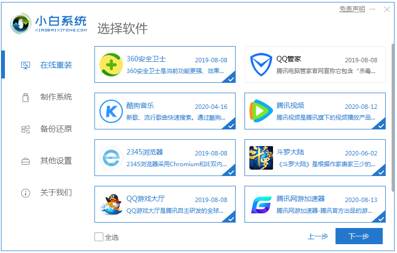 1、下载小白一键重装系统软件,选择在线重装系统,勾选要安装的其他应用软件,点击下一步。