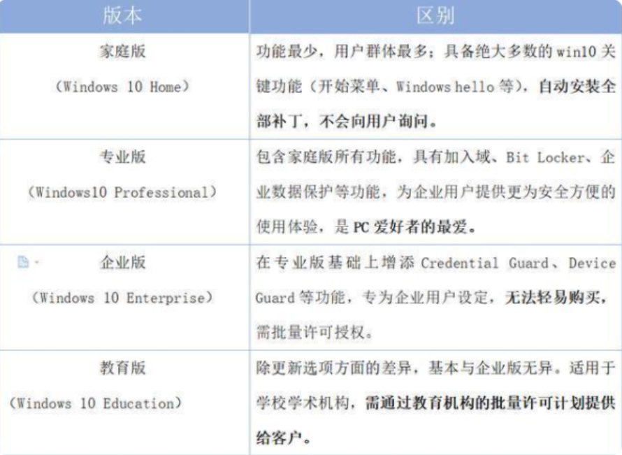 1、首先我们最常见的就是家庭版、专业版、企业版、教育版。一般来讲,大家在选购新机的时候,不论是线上还是线下购买,拿到手安装的系统都是win10家庭版。该版本主要面向普通用户,包含大多数基础功能。专业版比家庭版稍微厉害一点,拥有家庭版全部功能并新增安全类功能。企业版跟教育版听名字就知道针对的是企业跟教育机构,平常用户可能都用不到里面的功能。