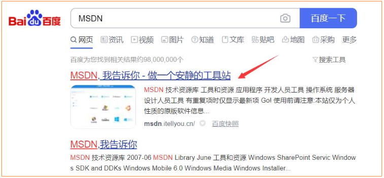 1. 首先打开电脑的浏览器搜索“MSDN”,找到“MSDN,我告诉你”官网点击进入。