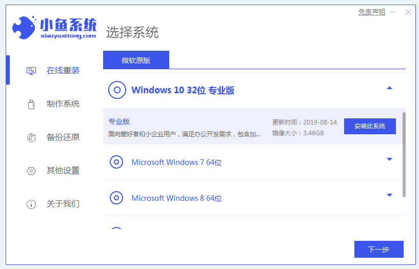 1、在官网上下载并打开小鱼一键重装系统工具,选择win10专业版,点击安装此系统,进行下一步。