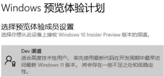4、在右侧点击“开始”,选择“dev”渠道就可以了,系统变会自动升级win11系统,等待升级完成进入新系统即可。(升级之前需要注册微软账号,没有的话就先注册)
