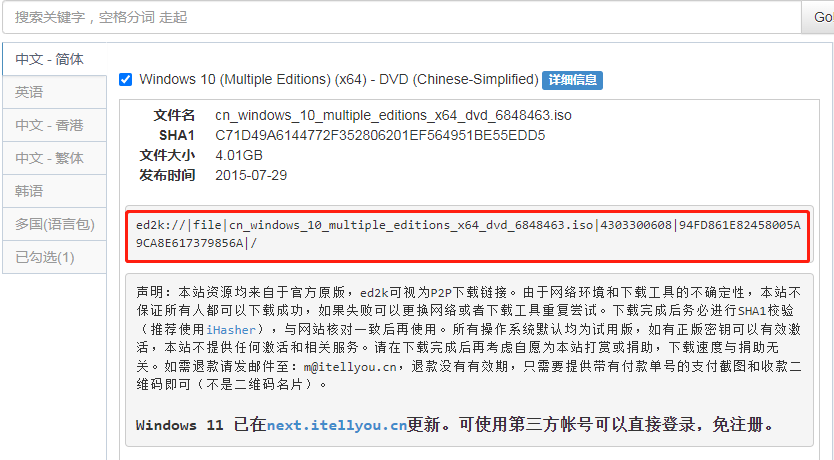 3、勾选windows 10ultimate (x64) - DVD (Chinese Simplified)。 x86代表win10 32位版本。复制下面的以ed2k开头的下载地址。
