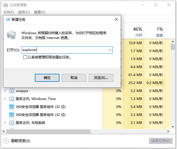 3、输入“explorer”,点击【确定】,等待系统重启管理器后就会出现桌面图标了。