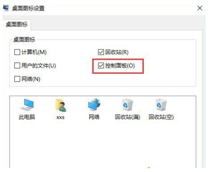 3、进入“桌面图标设置”窗口,选中“控制面板”前的框,最后点击确定即可。