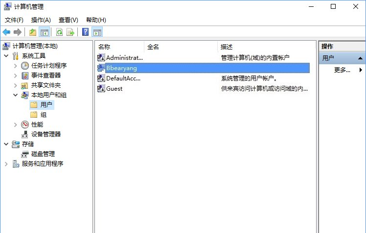 2、在计算机管理窗口中,点击左侧“本地用户和组”选项下的“用户”选项,找到当前用户帐户;