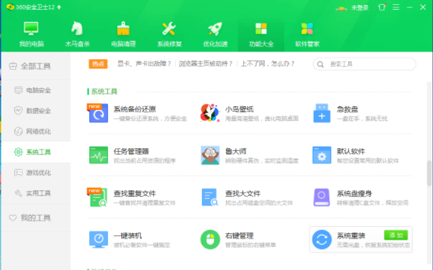 2、在功能大全中找到系统工具,然后在里面找到系统重装选项,点击添加。