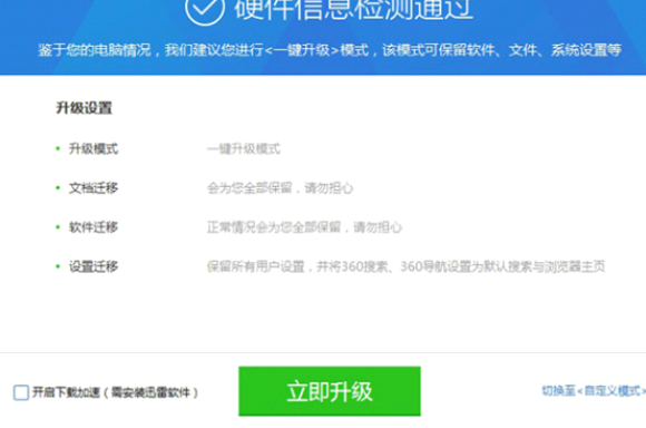 4、软件便会自动检测电脑安装环境,等待硬件信息检测通过后点击立即升级即可。