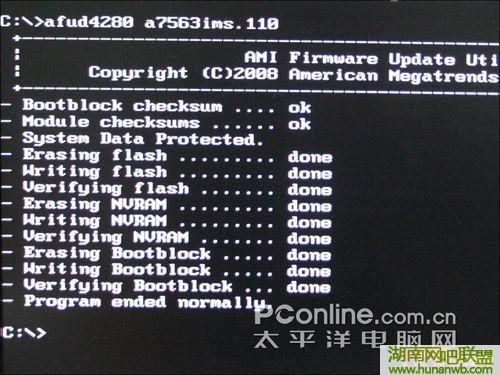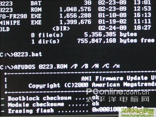 每个BIOS公司也都提供得有刷新BIOS的工具软件,只是使用起来没有这么方便而已。在提供批处理文件的压缩包中,其实就已经包括了一个官方的刷新工具,为了让用户更加方面,就提供了一个批处理文件,运行批处理文件后,批处理文件就会自动输入命令完成刷新过程。从下图中我们也可以看出来。
