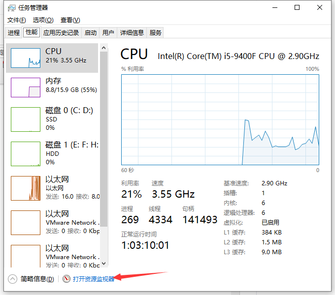 3、下方位置,点击如下图。打开资源监控器。