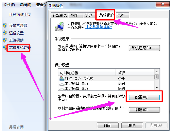 2、选择“高级系统设置”,点击“系统保护”,选择“配置”。