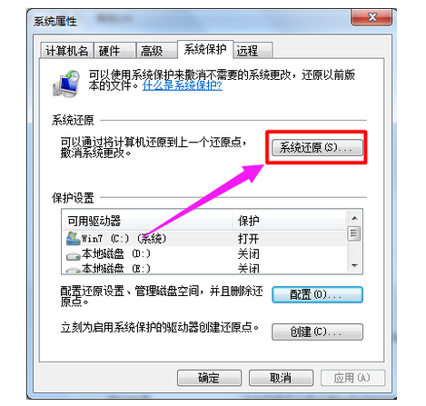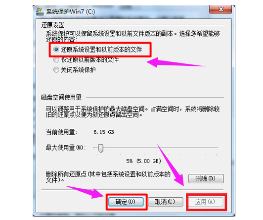 3、选择还原系统设置和以前版本,再点击应用和确定。