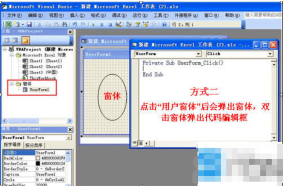 (说明一下:方式一打开的窗体没有默认对象,程序编写时如果要处理工作表或工作簿的数据,必须指明对象,如:对sheet2工作表的单元格进行处理,那么这样写sheet2.cells或sheets(2).cells;方式二和方式一打开的一样,需要指明程序处理的对象;方式三打开的代码框是默认的,也可以重新指定对象,如:双击sheet1工作表,那么在对应的代码框中如果不指定对象,默认对应的是sheet1工作表。)