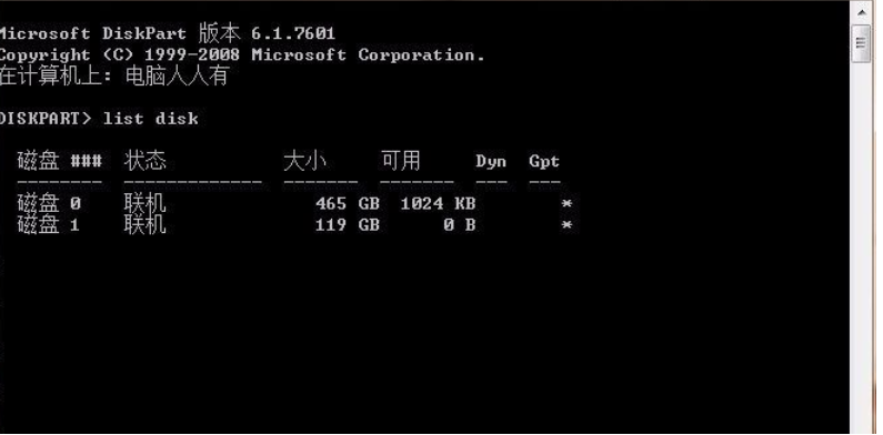 然后,输入:list disk 按回车(Enter键)→选择需要修改的磁盘。