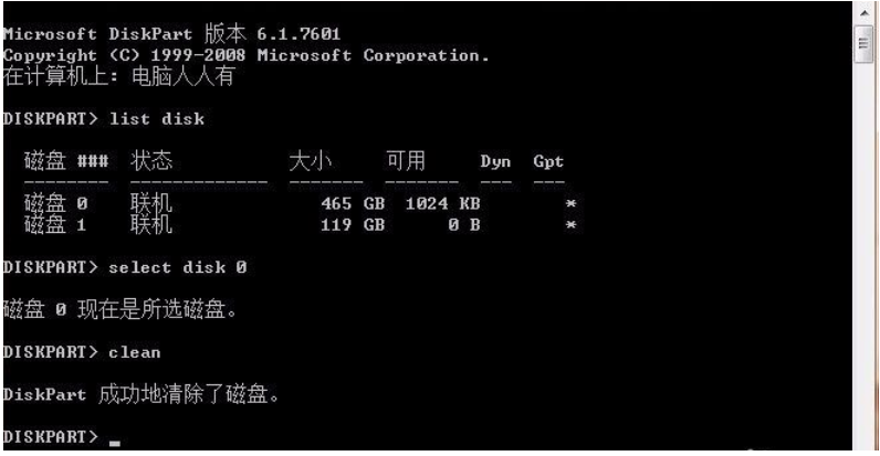 再输入:clean按回车(Enter键)就可以清除磁盘中所有的讯息了。