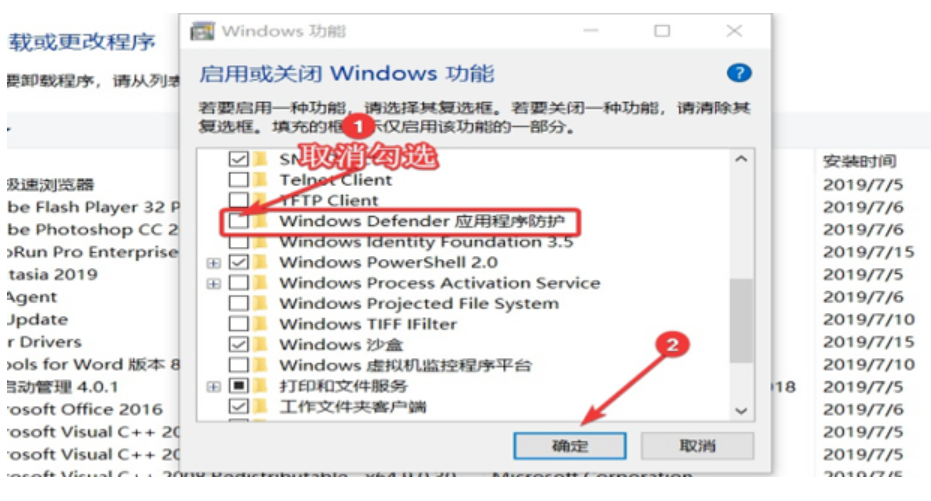 4、找到并取消【windows defender应用程序防护】前面的对勾,点击【确定】即可。