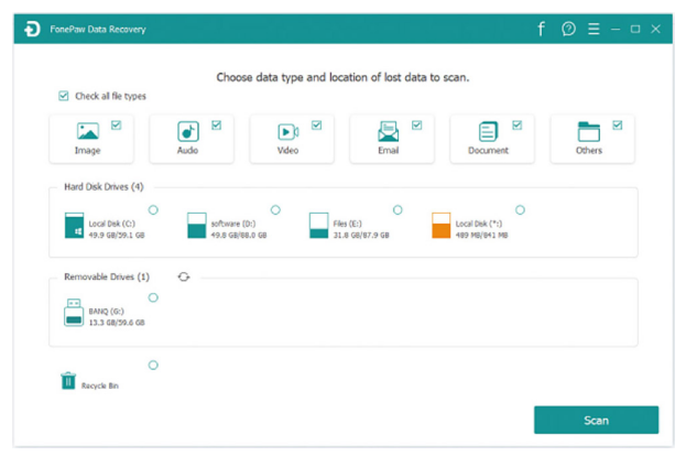 作为一款可靠的数据恢复软件,FonePaw Data Recovery可以从硬盘、SD卡、存储卡等介质中恢复已被删除的图像、音频、视频、电子邮件、文档、以及其他文件。您可以在Windows和macOS上使用它。