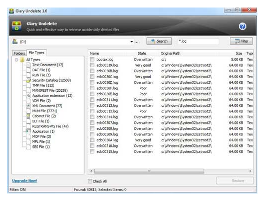 Glary Undelete将按需去深度扫描您的驱动器中是否有已被删除的文件,并向您显示每个已删除文件的属性及其所处的状态,以方便您估计对其恢复的可能性。也就是说,您可以通过其过滤和扫描的结果,来获悉被查找的文件,并按照可被恢复概率,对它们进行排序。