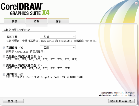 8.设置完功能界面后,单击“选项”进入该界面设置。这个界面只有两个选项,根据自己需求选择。设置后我们单击【现在开始】安装即可。