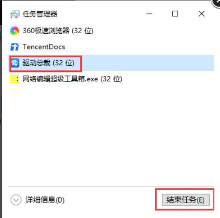 2、打开任务管理器后选择驱动总裁,点击右下方的结束任务。