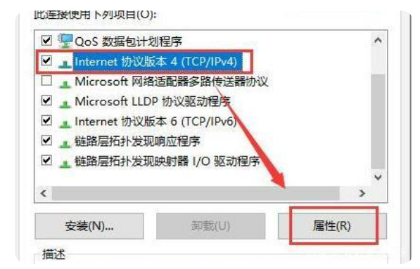 4、勾选“Internet 协议版本 4”后再点击“属性”。