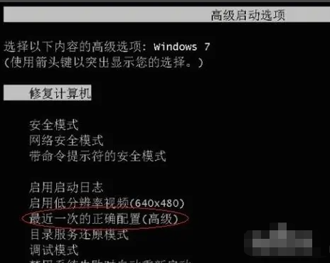 1、重启电脑,一直按F8进入到安全模式,进入到高级启动项后点击“最近一次的正确配置”。